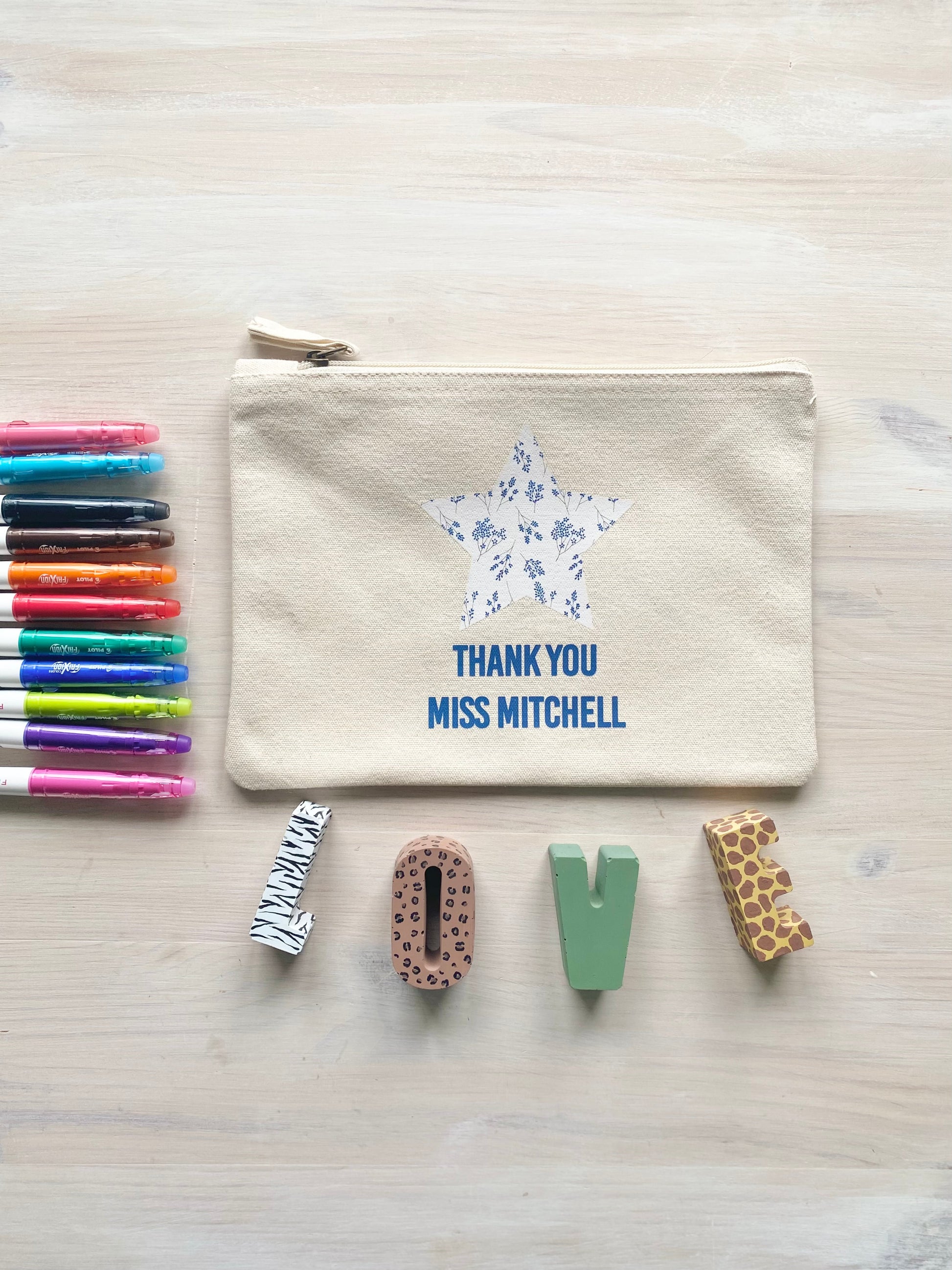 With the words " Thank You " and personalised with the teachers name with a pattern star this pouch is great for holding pens, pencils and other items a teacher needs.